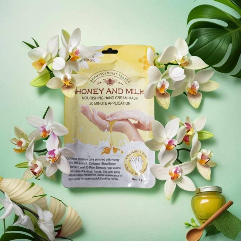 Honey & Milk hand mask contains nourishing ingredients like milk extract and honey extract, which leave a delicate, honey-scented veil on your hands.